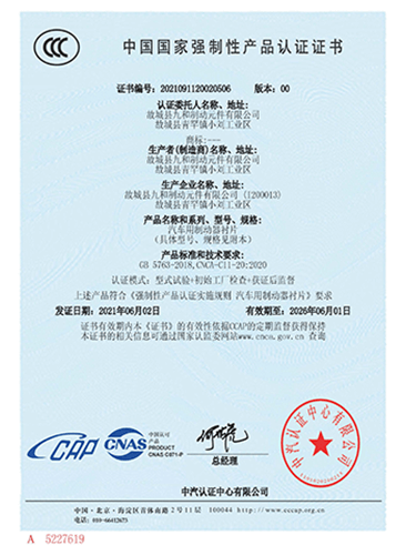 故城縣九和制動(dòng)元件有限公司主導(dǎo)產(chǎn)品為:汽車(chē)剎車(chē)片、裝載機(jī)剎車(chē)片。剎車(chē)片采用高溫高壓的熱壓工藝、設(shè)備、生產(chǎn)線(xiàn)、能保證質(zhì)量穩(wěn)定,有為主機(jī)廠(chǎng)配套生產(chǎn)的經(jīng)驗(yàn)和能力。劉如根商標(biāo)是公司主要商標(biāo),公司還有飛人標(biāo)牌、蛟龍牌、橫空出世等品牌!公司有多個(gè)剎車(chē)片檢驗(yàn)設(shè)備,剎車(chē)片摩擦性能定速摩擦試驗(yàn)機(jī)與國(guó)家非金屬礦制品檢驗(yàn)中心試驗(yàn)機(jī)是同公司生產(chǎn)的同型號(hào)試驗(yàn)機(jī)。拖曳試驗(yàn)機(jī)2020年通過(guò)中國(guó)建材檢驗(yàn)集團(tuán)咸陽(yáng)有限公司檢驗(yàn)合格,剪切試驗(yàn)機(jī);布氏和洛氏試驗(yàn)機(jī)。2021年公司通過(guò)國(guó)家強(qiáng)制性CCC認(rèn)證、通過(guò)過(guò)19001-2000idt ISO 9001:2015質(zhì)量體系認(rèn)證,IATF16949認(rèn)證,歐盟Emark認(rèn)證。剎車(chē)片執(zhí)行GB/T11834-2011、GB 5763-2018標(biāo)準(zhǔn)。公司產(chǎn)品先后曾給山東臨工、徐工、卡特彼勒(山工)、徐州美馳車(chē)橋公司、肥城金城橋公司,山東路通橋箱科技公司,山東博士樂(lè)公司,郯城郯液公司,日照金···